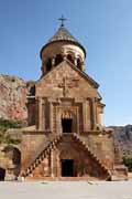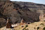 Pole byla rázem ta tam. Silnice stoupala a stoupala, kolem byly hory porostlé spálenou trávou. V osmnácti stech metrech jsme se přehoupli přes průsmyk Tuch Manuk a silnice začala padat do údolí řeky Arpa. Kousek za Areni nás ukazatel zavedl na odbočku ke klášteru Noravank. Silnice překonala řeku a zmizela v úzké průrvě mezi strmými skalami. Proklouzli jsme divokou soutěskou, která se rozšířila v údolí a pokračovala dalších šest kilometrů k jihu. Tam jsme vlevo ve svahu spatřili dva kostely kláštera Noravank, které díky barvě zdiva z dálky splývaly s okolními skalami.