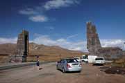 fotografie: Zorats KarerVrátili jsme se na hlavní silnici a pokračovali jsme na Goris. Minuli jsme odbočku na Tatev a za ní na dosud velmi slušné silnici výrazně přibylo výmolů. To už nám ale zbývalo jen nějakých 10km. A pak tu už byl monument, vítající nás v Gorisu. Od něj bylo vidět město v údolí a za ním skalní kužele místní přírodní zajímavosti. Sjeli jsme dolů a našli jsme b&b Lyovy Mezhlumyana (and son), kde jsme měli domluvené ubytování. Překvapením bylo, že nás zřejmě nečekali, nicméně jsme dostali pokoj s vlastním záchůdkem a sprchou, 7000 za osobu. Přeptali jsme se na možnost návštěvy Uchtasaru a pan Lyova hned někam telefonoval a říkal, že to možné je, ale budeme muset zaplatit celé auto, protože není dost zájemců. Tedy 25000 dramů. Oproti 30000 za osobu, za kteroužto cenu nám totéž nabízel chlapík v boudě u Zorac Karer, je to znatelně výhodnější. Cesta se uskuteční podle počasí, uvidíme zítra ráno.