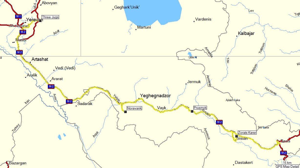 Měli jsme namířeno na jih. Naším cílem byl 250km vzdálený Goris. Tentokrát jsme neskočili GPS na to, že máme jet po již neexistující M15 a vzali jsme to poměrně úspěšně (i když možná ne nejkratší cestou) podle azimutu přes město, šťastně jsme se dostali na M2 a vydali se směr Meghri. V široké zelené nížině jižně od Jerevanu je silnice čtyřproudá a velmi slušná, podél ní jsou pole a sady a osídlení je hustší. V blízkosti osad silnici lemovaly stánky s nádhernou zeleninou a ovocem. Pak se zleva začaly přibližovat hory, silnice se zúžila a když jsme nepozorně projeli kruhový objezd v Yeraskhu přímo, po pár stech metrech před námi byl ostnatý drát a vojenské hlídky. Nachičevanská hranice. Otočil jsem to a na objezdu jsme se vydali správným směrem, na východ.